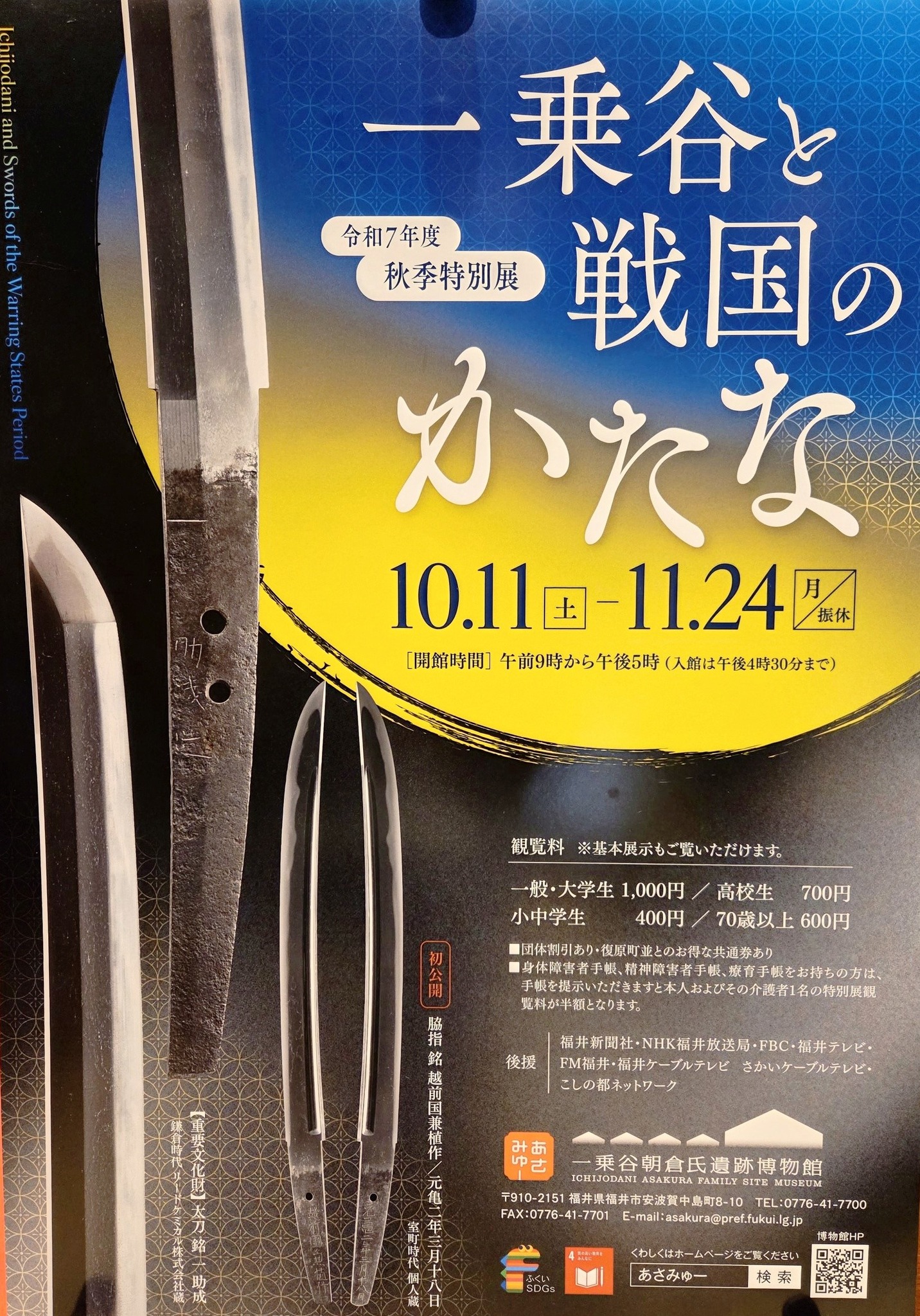 2025.10.10 活動報告 一乗谷朝倉氏遺跡博物館/秋季特別展 時は戦国時代、「日本刀」は武将の武器である一方で、家格の象徴や、将軍家・公家・大名間で用いられる贈答品という側面もあったそうです。学芸員さんによる説明で、ちょこっと戦国気分を味わうことができました。 とっても美しい刀剣ですが、館内は撮影禁止なので、実物はぜひご来館にて! 10/11~11/24までの特別展です。 シェアする