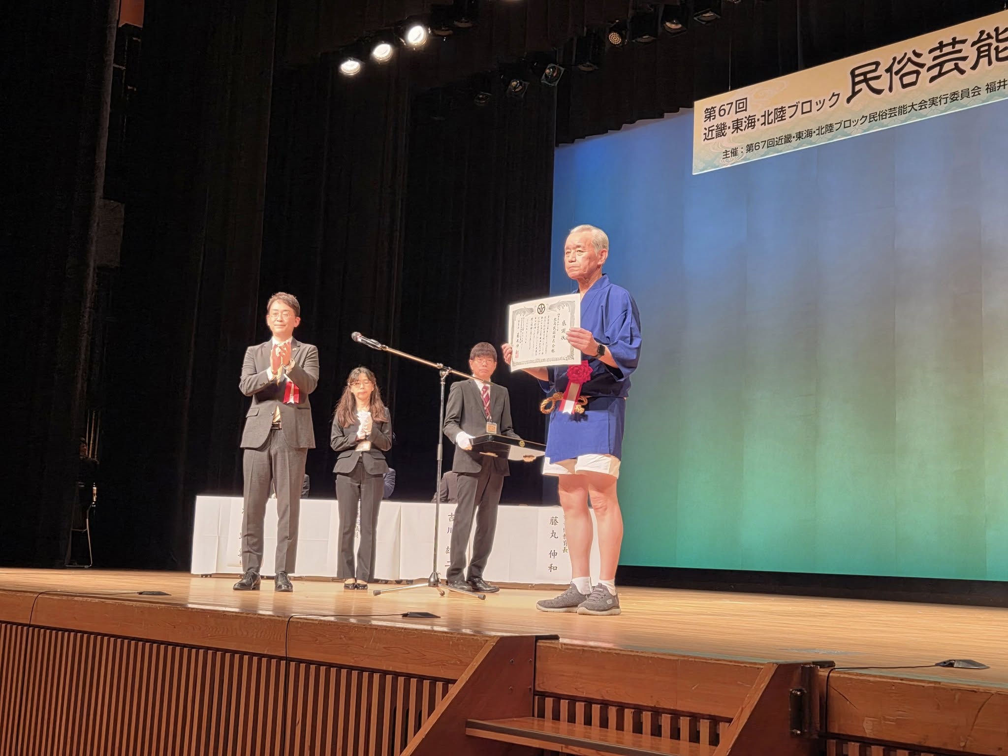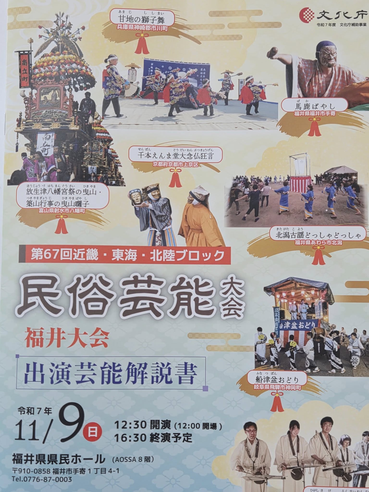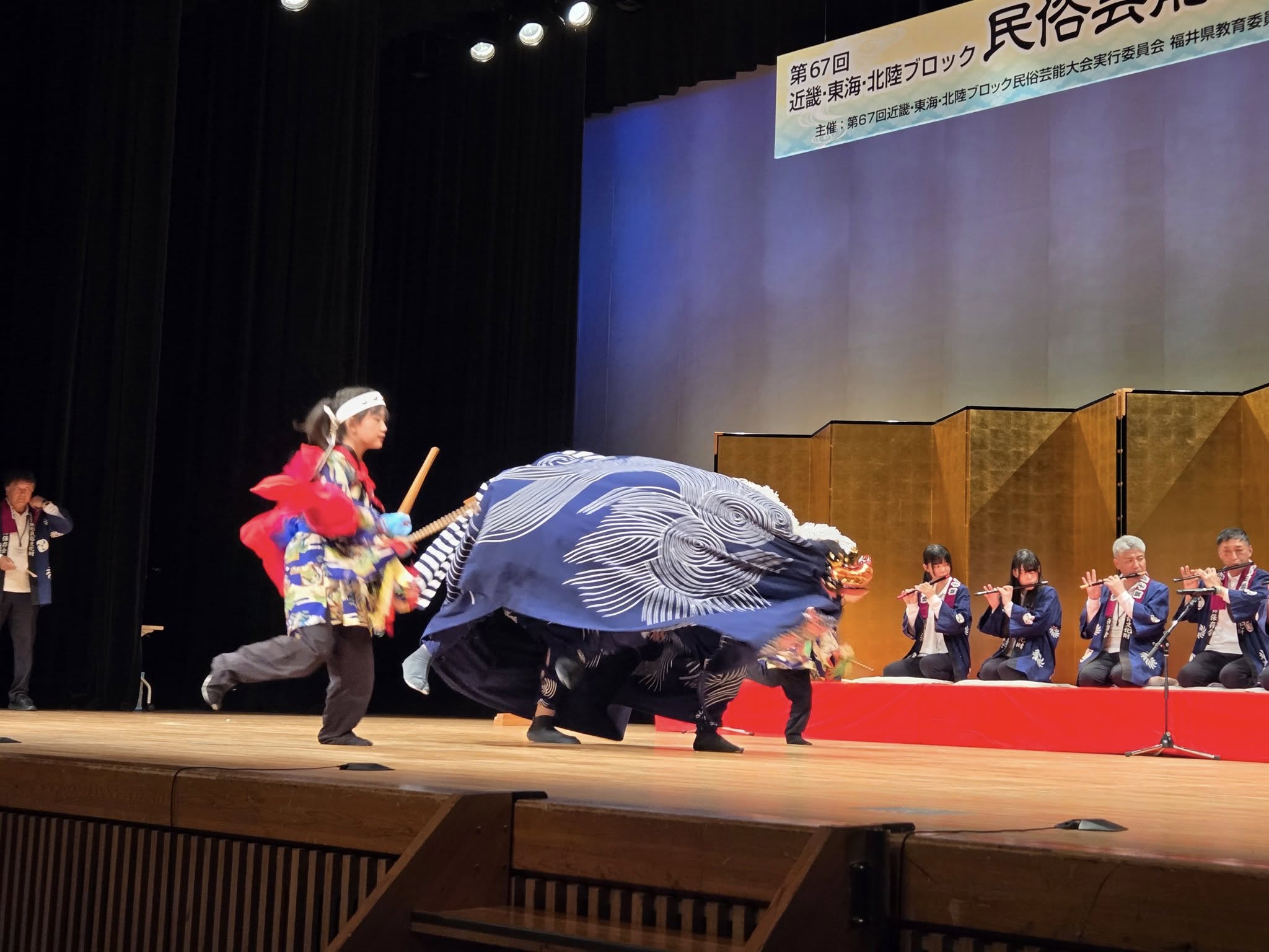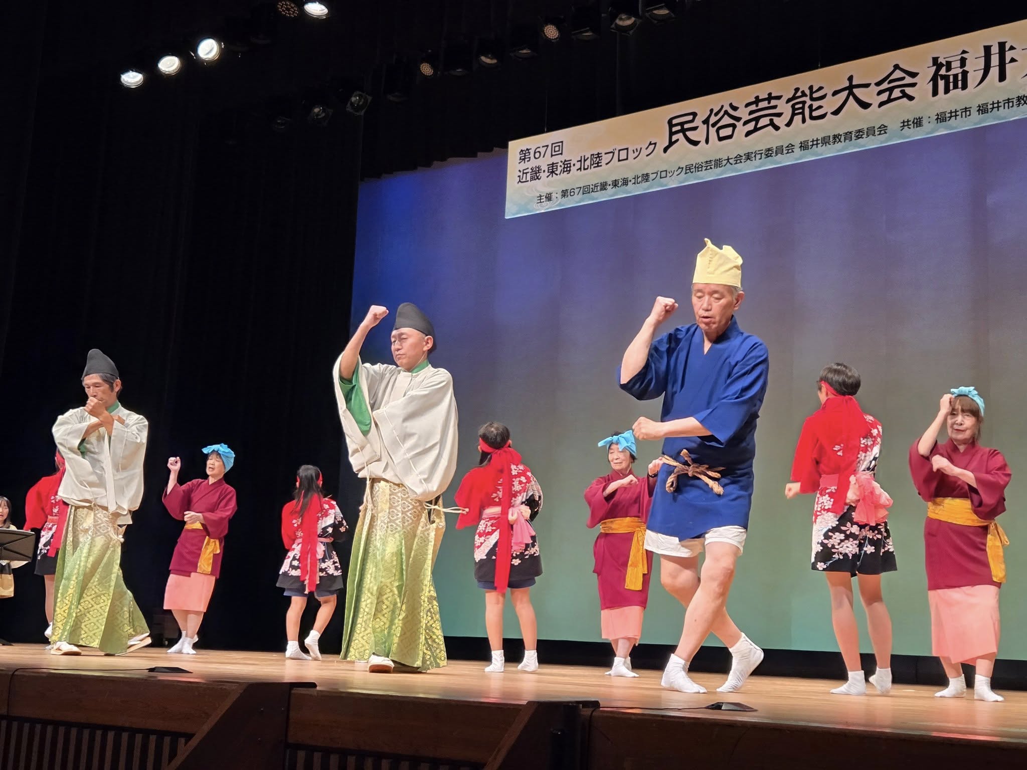 2025.11.09 活動報告 近畿・東海・北陸ブロック民俗芸能大会/福井県県民ホール 今年で67回目を向かえる「近畿・東海・北陸ブロック民俗芸能大会」が、AOSSA 8階の県民ホールにて開催されました。福井県からは、あわら市の「北潟古謡どっしゃどっしゃ」と、福井市の「馬鹿ばやし」が表彰され、他県からも獅子舞や念仏狂言、曳山囃子など、多彩な民俗芸能が表彰されました。無形民俗文化財の保存・伝承は、その地域の価値の高さを表しています。高齢化が進む中で、次の世代にバトンを繋ぎ、継承していってほしいと思います。 シェアする