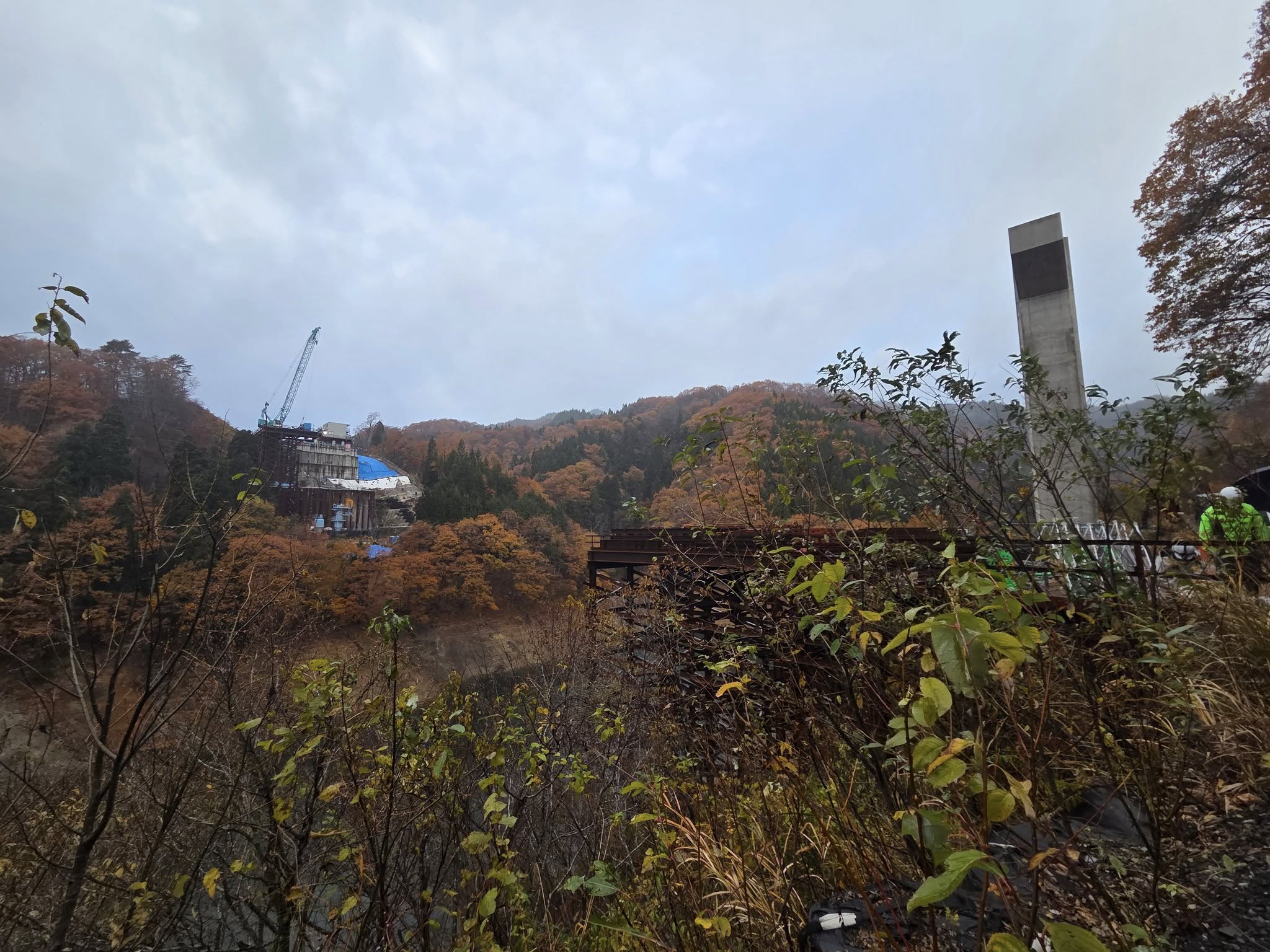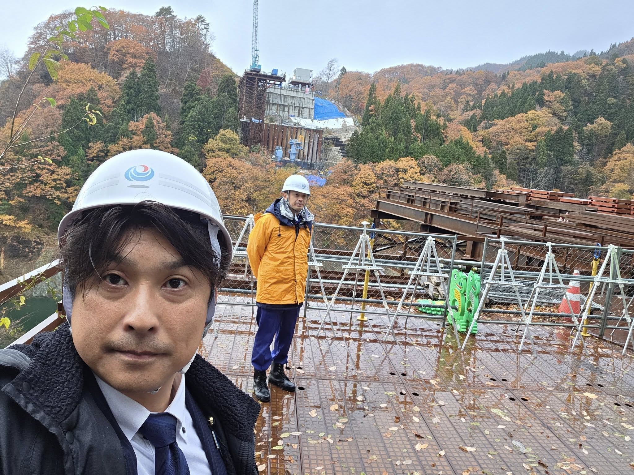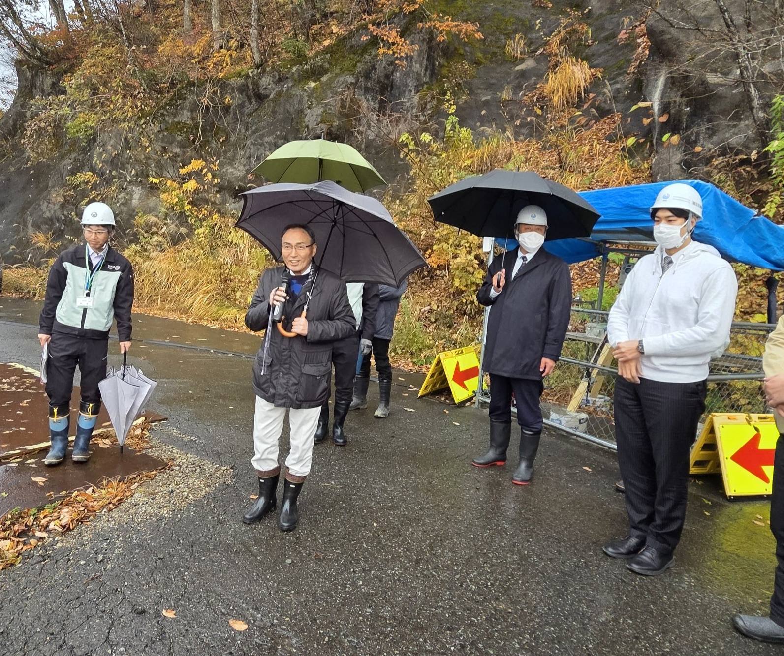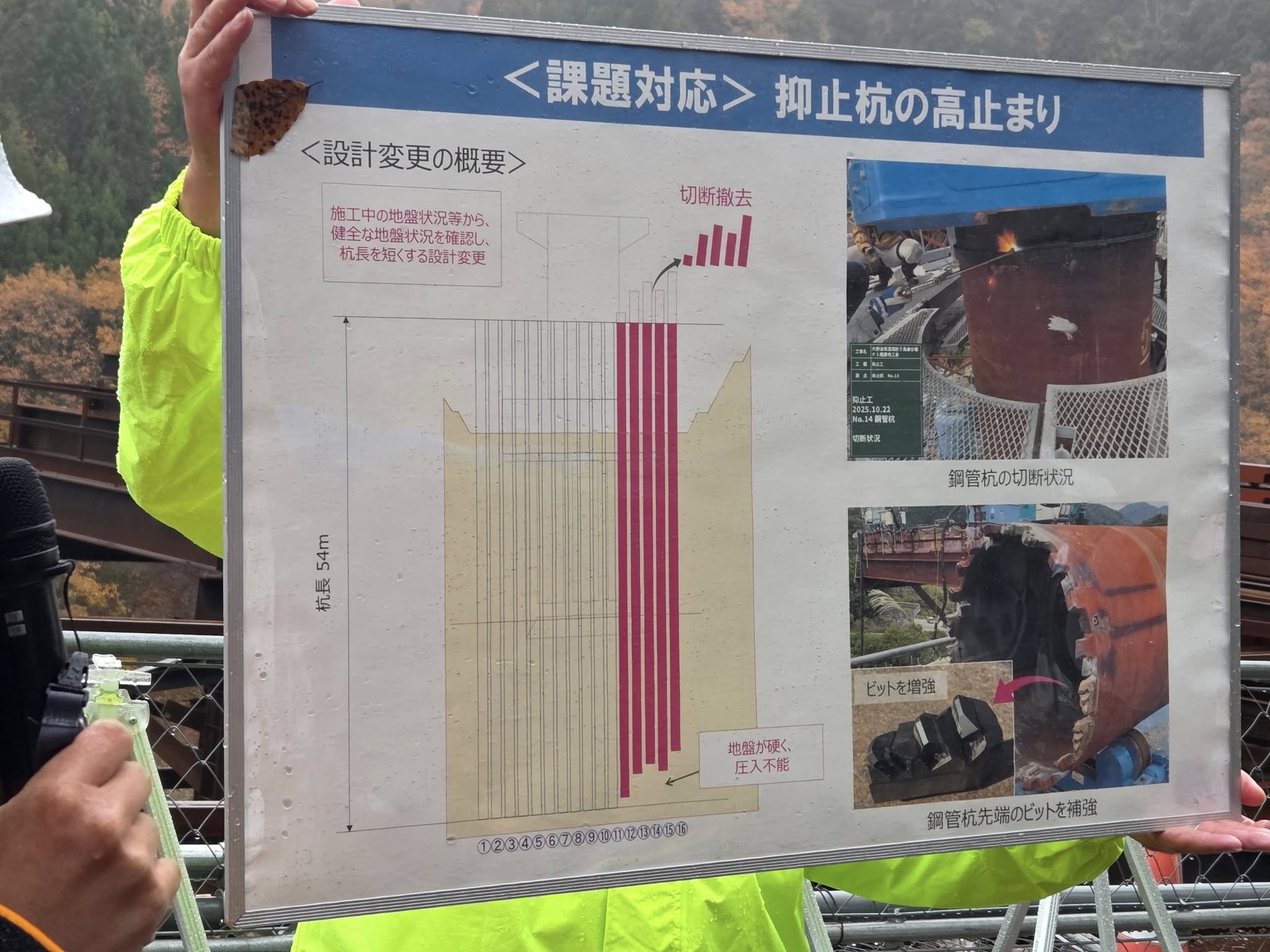 ケーソンという橋台を自らの重さで下げるという工法でしたが、山の側圧(横方向の圧力)が想定よりも強く、予定の深さまで下がりきらなかった為、50m級の鋼管杭を30本打ち込み側圧を緩和するという、全国でも珍しい事態が発生しており、専門家と協議の上、実行した対処法だそうです。完成は令和10年度中の予定ですが、あと3年で岐阜県や中京方面から多くの人がやって来ると思うと、こちらの準備も遅れを取らないように計画立てて、相互に完成を喜びたいと思います!