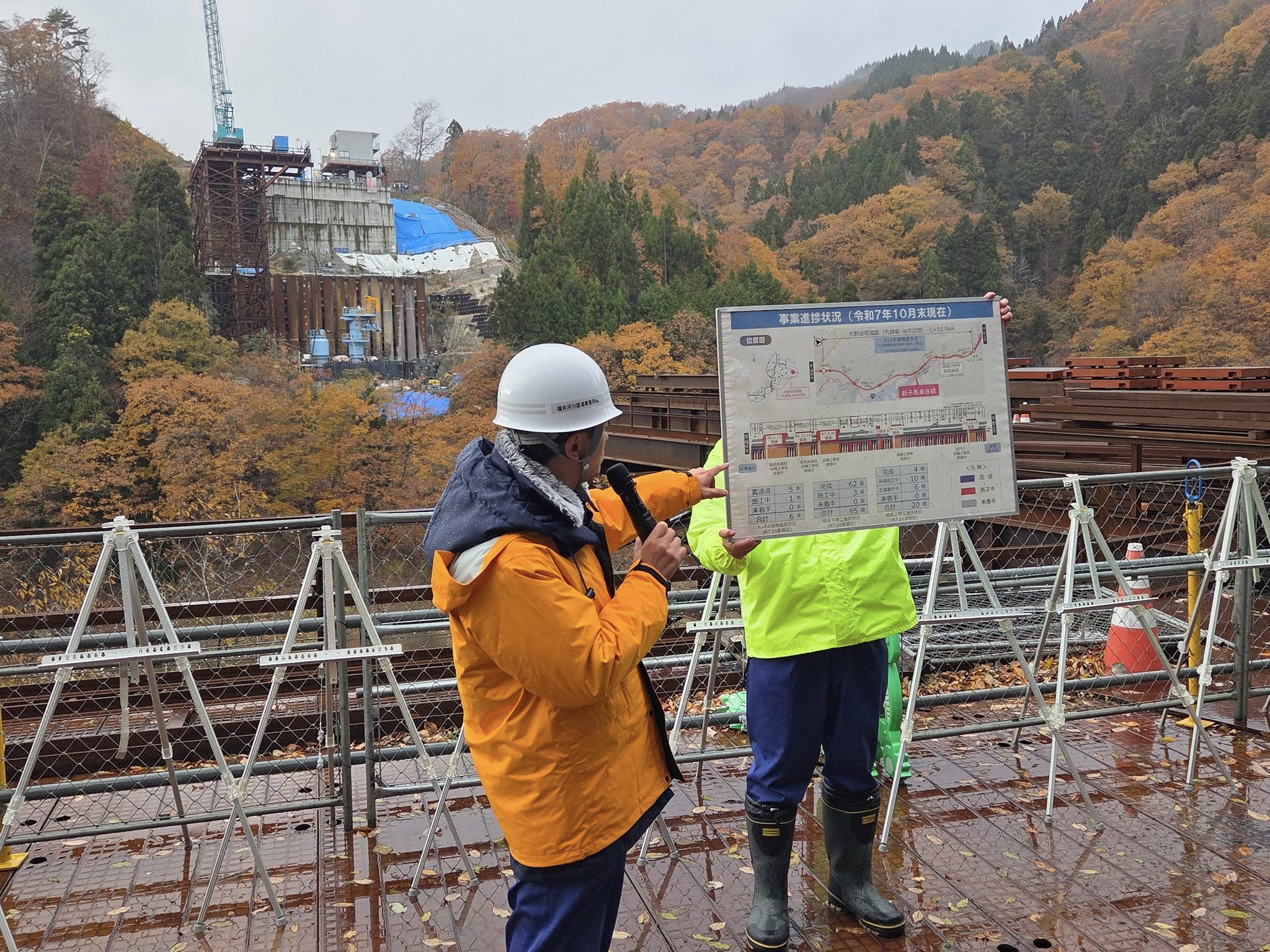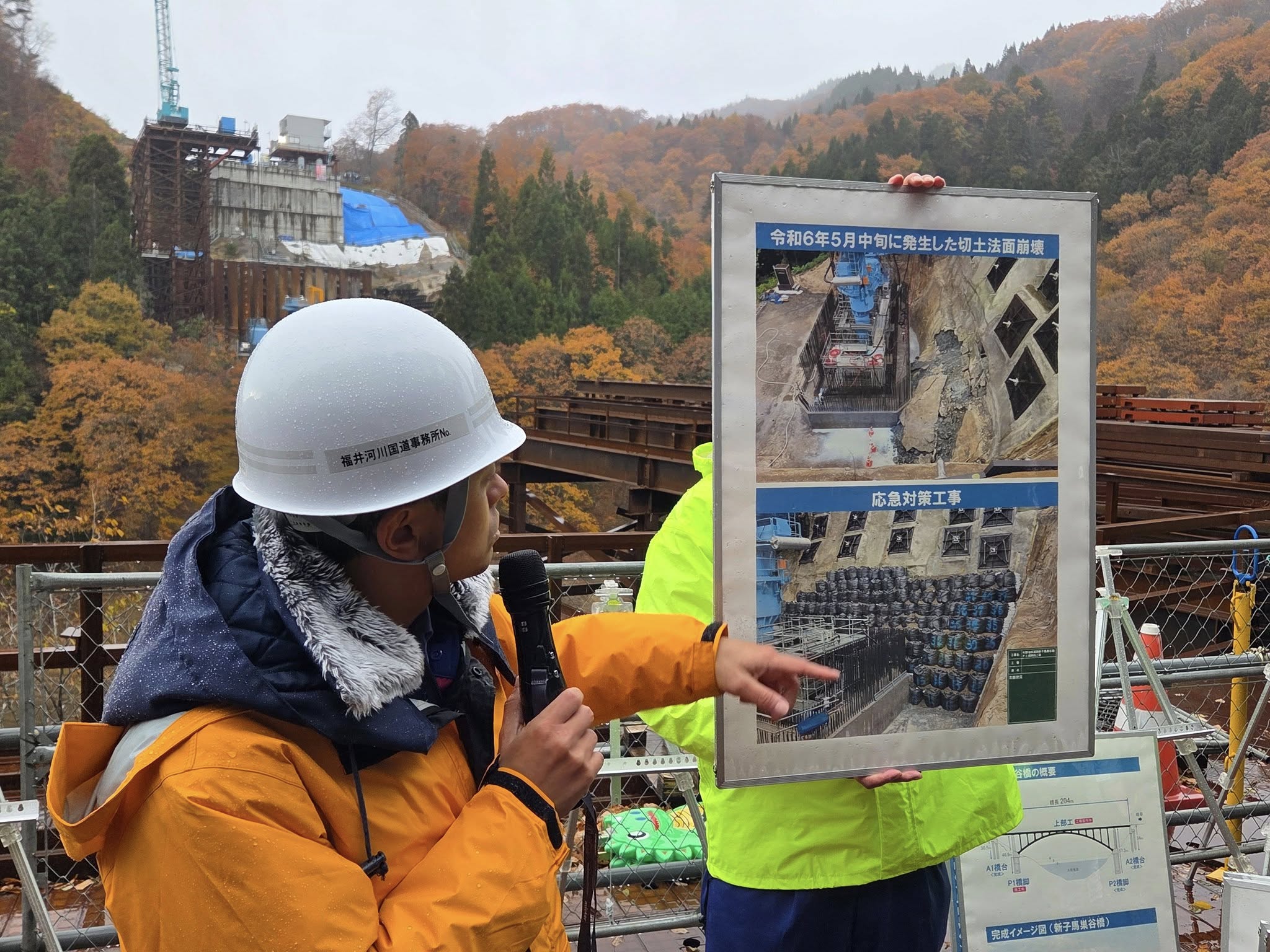 福井県議会高規格道路建設促進議員連盟で、建設費450億円増額が報じられた中部縦貫自動車道/大野油坂道路の新子馬巣谷橋(しんしばすだにばし)の工事現場を視察しました。