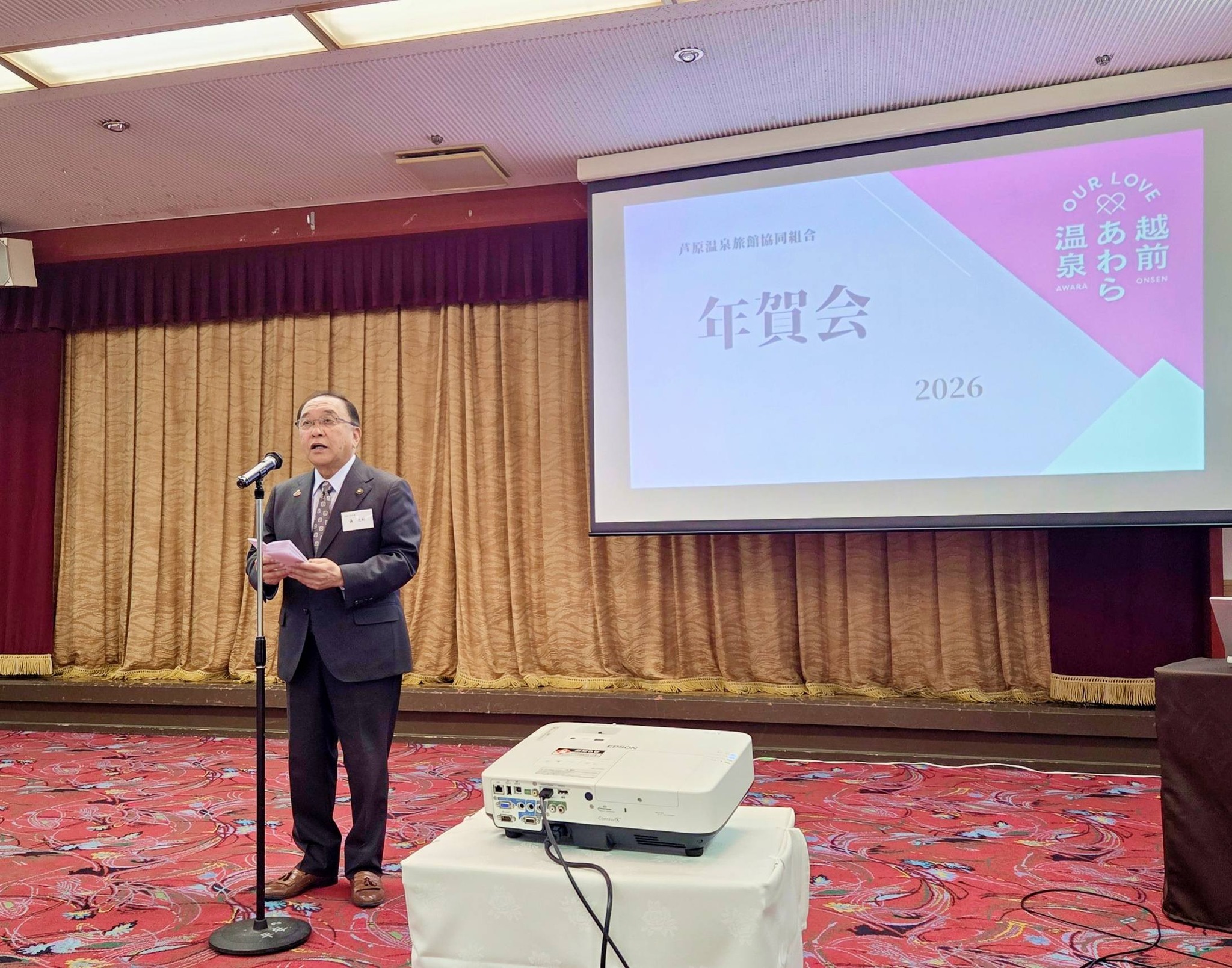 2026.02.24 活動報告 芦原温泉旅館協同組合年賀会/美松 時代が大きく変化する中、癒しと寛ぎの温泉文化も次の時代を見据え、変化の渦中にあります。にっぽんの温泉100選「全国7位」と大躍進したあわら温泉も「Reborn プロジェクト」を掲げ、量より質への戦略に転換しております。将来ビジョンを共有し、選ばれる温泉地であり続けるために、公民連携で活性化していきましょう! シェアする