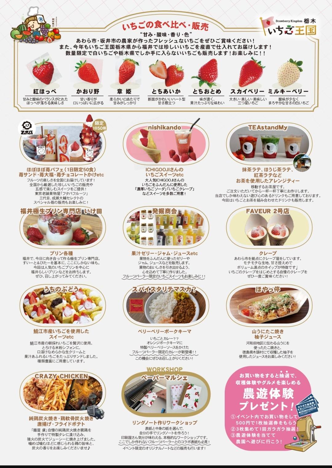 赤い宝石「いちご」をテーマにしたイベント「春のフルーツパーラー」がアフレアにて開催されていたので伺いました。あわら市産はもちろんのこと、いちご王国栃木県からも登場。さらに食べ比べもさせていただきました!香り高い「かおり野」、シャリシャリ食感の「スカイベリー」、真っ白でミルキーな「ミルキーベリー」など、品種の多さとバラエティの豊かさを感じさせていただきましたが、普段食べ慣れている「とちおとめ」が私の味覚のベースになっている事に気付かされました。